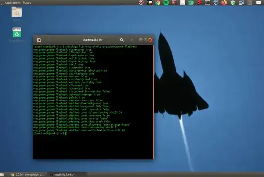 gnome-flashback, but if you have disabled them withgsettings set org.gnome.gnome-flashback.desktop show-icons falseicons should not be on desktop! Can you restartgnome-flashbackfrom terminal?gnome-flashback --replace. Does it output something in terminal? – muktupavels Aug 28 '20 at 10:56(base)in your terminal has something to do with your problem? From quick search it is fromconda... Can you deactivate itconda deactivate? Then try again to disable desktop icons withgsettings set org.gnome.gnome-flashback.desktop show-icons false. – muktupavels Aug 28 '20 at 11:05