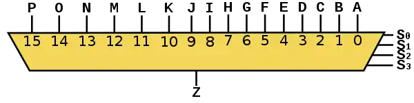 A multiplexer is an input selector. A multiplexer has an output, a control input, and several data inputs. For ease, we number multiplexer inputs from zero, at the top. If the control signal is "0", the 0th input is moved to the output. If the control signal is "3", the 3rd input is moved to the output.