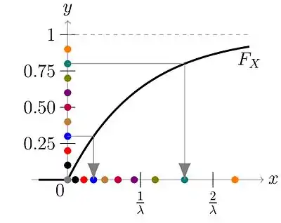 Random numbers yi are generated from a uniform distribution between 0 and 1, i.e. Y ~ U(0, 1). They are sketched as colored points on the y-axis. Each of the points is mapped according to x=F-1(y), which is shown with gray arrows for two example points. In this example, we have used an exponential distribution. Hence, for x ≥ 0, the probability density is and the cumulated distribution function is . Therefore, . We can see that using this method, many points end up close to 0 and only few points end up having high x-values - just as it is expected for an exponential distribution.