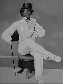 ʻIoane was also renowned for his manner of dress and he was often seen on the streets of Honolulu with a velvet suit, jackets and slacks, white gloves, a cane, monocle and either a high silk hat or a beaver skin hat. Local English newspapers dubbed him the Hawaiian Dandy or the Hawaiian Beau Brummel.[14] He was often mistaken for a prince by visiting foreigners.[15][16] Lacking the financial means to purchase his fashionable wardrobe, he personally designed his own clothing, which his wife helped make, from donations made to him by his patrons and admirers. His image was later featured on a local brand of smoking tobacco.[3][17] Anthropologist Jane Desmond noted that ʻIoane's appearance and manner of dress in photographs "unusual, when compared with tourist representations, as an image of an obviously successful Native Hawaiian male."[18]