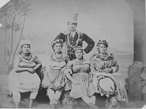 Public performance of hula had been banned and heavily disparaged as heathen and lewd since the regency of Queen Kaʻahumanu due to the disapproval of the American Protestant missionaries. This changed during the reign of King Kalākaua (r. 1874–1891) who revived hula into cultural prominence.[8][9] During the coronation celebration of King Kalākaua in February 1883, ʻIoane and his troupe conducted public hula performances each night on the grounds of ʻIolani Palace. The festivities culminated in a grand luau at the palace, on February 26, which was attended by 5,000 people. The Pacific Commercial Advertiser, which gave a positive coverage the event of the luau, noted: "Dandy Ioane ... marshalled the performing girls in their short skirts and hula buskins, and accompanied their gyrations with his tremulous-toned instrument [a jew's-harp]."[10][11] The king was heavily criticized by his opponent and foreigners for sanctioning the public performance of hula, which had been banned since the days of the missionaries in Hawaii.[12][13]