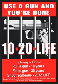 The Florida Statute 775.087,[1] known as the 10-20-Life law, is a mandatory minimum sentencing law in the U.S. state of Florida. The law concerns the use of a firearm during the commission of a forcible felony.[2][3] The Florida Statute's name comes from a set of three basic minimum sentences it provides for. A public service announcement campaign accompanied the law after its passage under the slogan "Use a gun, and you're done."[4][5][6]