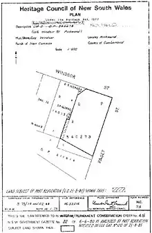 In the late 1970s, the building was threatened with demolition for a planned car yard. Demolition had already commenced when the building was purchased by the state government on the advice of the Heritage Council of New South Wales, the first to be acquired under new heritage preservation powers. The work on 126 Windsor Street was intended to serve as an example of the way a building in poor condition which was threatened by demolition can be restored and given a new lease of life at a moderate cost.[6][1]