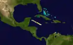 As the previous storm was moving along the coastline of the southeastern United States, a new hurricane was observed in the western Caribbean Sea, about halfway between Honduras and Jamaica. Its intensity, based on a ship report, was estimated at 105 mph (169 km/h). The hurricane moved slowly west-northwestward, and another ship experienced its strong winds on October 7. There were no further observations, so its complete track is unknown.[1][2]