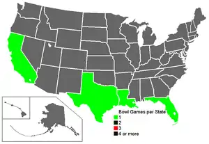 ![]() Number of bowl games per state | |||||||||||||||||||||||||||||||||||||||||||||