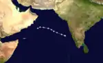A low-pressure area developed off the Karnataka–Goa coastline in the Arabian Sea on May 27, and developed into a depression on the next day. The system developed further into a cyclonic storm on May 29 as it moved to the north. The storm reached its peak with 95 km/h (60 mph); soon after this, as it turned to the west, but soon degenerated into a deep depression over the northern Arabian Sea on May 31. The depression continued to move westward, weakening to a remnant low shortly afterward, as it made landfall on the Arabian Peninsula, on June 2. The remnant low dissipated over southern Saudi Arabia on the next day.[2] The cyclone itself had minimal effects on land, but the monsoon advanced into western India in late May in association with the system. As the cyclone moved to the west away from the subcontinent, the incursion of moist air from the Arabian Sea persisted over northwestern India for the first three days of June. This brought moderate rainfall to regions of Gujarat, Rajasthan and western Madhya Pradesh.[2]