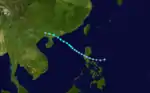 Development of this system was slow within the eastern portion of the monsoon trough. By midday on July 2, the disturbance was first noted about 1,020 kilometres (630 mi) southwest of Guam. The system moved northwest for much of its life cycle, initially following Alex and then the southwest side of the subtropical ridge. A broad tropical depression formed on the afternoon on July 5 within the disturbed weather area, weakening as it passed over Luzon. Late on July 7, ship reports indicated the system had become a tropical storm. The cyclone moved within the radar fence of Hong Kong near its peak intensity before making landfall 250 kilometres (160 mi) to its west-southwest during the early afternoon of July 9. Winds gusted to 70 knots (130 km/h) at Green Island.[1] Weakening over the topography of China was rapid thereafter, and the system dissipated by early on July 10.[5]