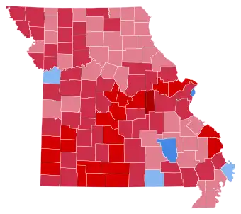 The presidential election of 1984 was a perfectly partisan election in Missouri, with 100% of the electorate voting for either the Democratic or the Republican nominee, as only those two appeared on the ballot.[1] Accordingly, every county gave either Mondale or Reagan an outright majority: five (including the county-equivalent of the city of St Louis) gave Mondale a majority; the rest gave Reagan one. Reagan's strongest performance was in Gasconade County, which gave him 80.54% of its ballots; Mondale's was in the city of St Louis, which gave him 64.80%. Missouri weighed in for this election as 2 percentage points more Republican than the national average. Reagan won the state in a landslide, amassing over 60% of the vote, slightly more than his national vote share. Republicans would not win the state again by double digits until 2016.