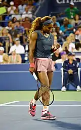 Playing in her first tournament as the world no. 1 at the Sony Open Tennis as the top seed she received a bye into the second round where she faced Italian Flavia Pennetta. Williams took the first set with a loss of one game; she come back from triple break point down twice and she was 2/10 in break point opportunities. The second set was won by Williams by the same score.[23] Williams then took on Ayumi Morita, Morita took the first 3 games of the match, but Williams pegged back taking the next 7 games, Williams then broke Morita in the sixth game of the second set to take the match.[24] In the fourth round, she faced Slovakian Dominika Cibulková, the match started with 2 breaks, Cibulková then took the next seven games from the fourth game, to take a set and break lead. Williams then took the next six games from, in the process winning the second set. Williams then completed her comeback, winning the third by 2. Williams ended with 40–41 winners-unforced errors to her opponents 12–19 ratio.[25] In the quarterfinals, Williams faced Li Na. Williams took the first set breaking Li in the sixth game of the match. In the second set Williams took a break lead but Li took the next five games and had a set point on the Williams serve, Williams saved the set point and took the next four games to force a tie-break, that went to Williams.[26] In the semifinals, she faced fourth seed and defending champion Agnieszka Radwańska. Williams took the first set without dropping a game. In the second set Williams broke Radwańska in the third game to finally take the set and the match. She hit 40 winners and 21 unforced errors to Radwańska's 6 winners and 12 unforced errors. Williams made 12 aces including 5 in the third game of the second set.[27] In the final Williams faced Maria Sharapova. Sharapova got the decisive break in the ninth game and serve the set out. This ended the 13 straight sets Williams had won over Sharapova and the first she had lost in 5 years. In the second set, Williams won the first two games before Sharapova reeled off three straight games herself. Being a break down Williams reeled off 10 straight games to win the match. Williams had a 34–29 winners-to-unforced errors ratio to Sharapova's 14–25. This win gave Williams the most titles at the tournament at six and most wins at the event at 61 and is tied with Agassi in both accolades. This win also meant that Williams has beaten Sharapova 11 straight times.[28][29]