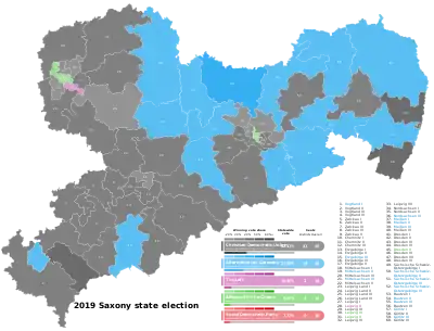 In the 2014 state election, the CDU entered into coalition with the SPD. Since then, Saxony emerged as a stronghold of the Alternative for Germany (AfD), which achieved its best results in Saxony in national elections since. It won narrow pluralities in the state in both the 2017 federal election, winning 27.0%, and the 2019 European elections, winning 25.3%.[3]