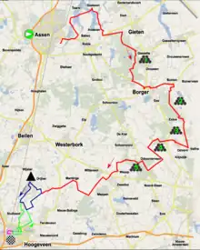 The 156 kilometres (97 mi) route from Assen to Hoogeveen uses generally flat roads in the Drenthe region of the Netherlands, with the challenge being four ascents of the VAMberg - a hill built on a landfill site. The climb is 750m in length with an average gradient of 4.2% and a maximum gradient of 20%.[3] Other difficulties are the ten cobbled sections on the route.[4]