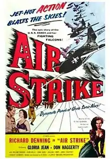 Air Strike is a 1955 American drama film written, directed and produced by Cy Roth and starring Richard Denning, Gloria Jean and Don Haggerty; the supporting cast features former child star Billy Halop.[1] The plot involves pilots training at a United States Navy squadron preparing for the Korean War.[2] The film features the original song, "Each Time You Leave Me" by composers Sylvia Ostrow and André Brummer.[3]