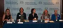 At American Society of International Law Women's Interest Group panel discussion on 31 August 2014, (l—r) Christine Edwards, Elizabeth Anderson, Pamela Fierst, Sandra L. Hodgkinson, and Marcia Wiss discuss international law and careers.
