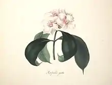 The Roupells returned to Madras in 1845 where Arabella Roupell continued her botanical painting. When Wallich retired to London from Calcutta in 1846, he persuaded her to allow him to take along some of her paintings to show to Sir William Jackson Hooker. Hooker was delighted with her work and with Arabella's botanist brother-in-law, George Roupell, chose ten of the plates for publication. Having received the blessing of both Hooker and Wallich, the plates were handed to the eminent Victorian lithographer, Paul Gauci, who prepared the illustrations for the printer W. Nicol of the Shakespeare Press on Pall Mall. The descriptive text accompanying the plates was provided by William Henry Harvey, the Irish botanist. One hundred subscribers were listed, a large portion being from the Peerage, and not counting Victoria, Prince Albert and the Directors of the East India Company.[3] The book was well received not only in England, but also on the Continent, where the author was elected a member of the Regensburg Society of Arts. The work is dedicated to Wallich in recognition of his 'flattering encouragement and scientific guidance' with 'every feeling of grateful and affectionate esteem.' It is thought that only 110 copies of the atlas folio were printed, making the work rare, expensive and highly desirable to collectors.[3][4]