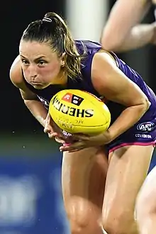 Ashley Sharp (born 11 June 1997) is an Australian rules footballer who played for the Fremantle Football Club in the AFL Women's competition. Sharp was drafted by Fremantle with their third selection and twentieth overall in the 2016 AFL Women's draft.[1] She made her debut in the thirty-two point loss to the Western Bulldogs at VU Whitten Oval in the opening round of the 2017 season.[2] After the round three match against Greater Western Sydney, in which she recorded nine disposals and three goals, she was announced as the round nominee for the AFL Women's Rising Star.[3] She played every match in her debut season to finish with seven matches.[4]