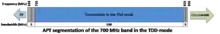 The Asia-Pacific Telecommunity (APT) band plan is a type of segmentation of the 612–806 MHz band (usually referred to as the 600 MHz & 700 MHz bands) formalized by the APT in 2022–2023 and 2008-2010 respectively[1] and specially configured for the deployment of mobile broadband technologies (e.g. most notably Long Term Evolution, LTE). This segmentation exists in two variants, FDD and TDD, that have been standardized by the 3rd Generation Partnership Project (3GPP)[2] and recommended by the International Telecommunication Union (ITU)[3] as segmentations A5 and A6,[4] respectively. The APT band plan has been designed to enable the most efficient use of available spectrum. Therefore, this plan divides the band into contiguous blocks of frequencies that are as large as possible taking account of the need to avoid interference with services in other frequency bands. As the result, the TDD option (segmentation A6) includes 100 MHz of continuous spectrum, while the FDD option (segmentation A5) comprises two large blocks, one of 45 MHz for uplink transmission (mobile to network) in the lower part of the band and the other also of 45 MHz for downlink transmission in the upper part. As defined in the standard, both FDD and TDD schemes for the 700 MHz band include guard bands of 5 MHz and 3 MHz at their lower and upper edges, respectively. The FDD version also includes a centre gap of 10 MHz. The guard bands serve the purpose of mitigating interference with adjacent bands while the FDD centre gap is required to avoid interference between uplink and downlink transmissions. The two arrangements are shown graphically in figures 1 and 2.