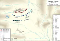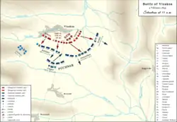 At about 8 (9) o'clock in the morning the imperial columns arrived at the Vízakna Plateau in front of Bem's advance line.[2] The approaching of the Austrian troops were first observed by the soldiers of Major Kálmán Csutak, who reported this to Bem,[5] at which the latter deployed his troops in battle formation as follows: on the left flank, under Major Zsurmay, 2 companies of the 4th Honvéd battalion, 1 company of the Vilmos-Hussars, 1 company of the Kress-cuirassiers and 4 guns; on the right flank, under Major Gergely Bethlen, the 31st Honvéd Battalion, one company of the Matthias Hussars and 4 cannons. The remainder of the army, i.e. Kemény's battalion, 4 companies of the 4-th Honvéd Battalion, the Vienna Legion and some guns, under Bem's personal command, took up their positions in the center.[2]
