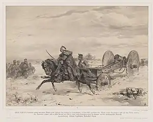 15 of his guns could no longer be saved, largely due to the fact that, prior to the battle, Bem had given strict orders to his headquarters commander, Major Bayer, in case of retreat, not to send away the troop's carriages until he had received a personal order from him (Bem) to do so.[2] Because of this, the confused and disordered train blocked the exits of Vízakna when the Hungarians tried to retreat, and only a small part of the artillery was able to make its way through.[2] In one of the streets of the town, the escape of the soldiers, stuck because of the piled-up cannons and carts, was made even more difficult by the fact that their rifles had run out of ammunition, so the Hussars who came close to them gave them their own cartridges, which they used to repel the attack of the Austrian grenadiers, giving them time to escape by pulling away the vagons from their way.[10] The completely scattered Hungarian army retreated in a mad dash through Toporcsa-Kisapold towards Szerdahely; the remnants of Zsurmay's left flank retreated through Mundra-Nagyselyk towards Medgyes.[2] The squadron of Colonle Losenau with 9 guns, which tried to pursue the Hungarians were repulsed by Bem's remaining artillerists, who also destroyed the bridges and roads to slow them down.[15] There is no doubt that in the event of a vigorous pursuit, Bem's army would have had hardly any troops left, but fortunately the imperials, because of the heavy snow which made it difficult for the cavalry to quickly advance, did not interfere much with the flight of the broken Hungarian army.[2] About 2 hours after the fighting had ended, Colonel Losenau was ordered to give chase with 2 1/3 battalions, 2 companies of cavalry and 1 1/2 batteries, which column reached Kisapold in the evening without reaching the retreating Hungarians, and because of the extreme cold and the exhaustion of the troops, he gave up further pursuit.[2] On the day of the battle, most of the Austrian army advanced as far as Toporcsa (a village near Vízakna), where they spent the night.[2]