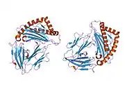 β2 microglobulin (B2M) is a component of MHC class I molecules. MHC class I molecules have α1, α2, and α3 proteins which are present on all nucleated cells (excluding red blood cells).[5][6] In humans, the β2 microglobulin protein[7] is encoded by the B2M gene.[6][8]