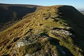 The Black Hill (also known as Crib y Garth) is a hill (elevation 2100 feet or 640m) in the Black Mountains in Herefordshire, England at grid reference SO275348. It rises just west of the village of Craswall, near the border with Wales. The southern part of the ridge leading to the summit is a rocky knife-edge giving excellent views to either side. The northern part crosses a peat bog on gently sloping land at the edge of the east facing escarpment. The lower part is very similar to the main ridge of the Skirrid mountain near Abergavenny, owing to their similar underlying geology. The Black Hill is known locally as the 'Cat's Back,' as viewed from Herefordshire it looks like a crouching cat about to pounce.