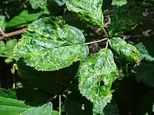Mosaic pattern on leaves of raspberry plant, also a characteristic of Blueberry mosaic associated ophiovirus | |