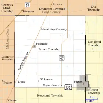 The city of Fisher lies in the southeast corner of the township; portions of the town extend into neighboring townships, but the majority is in Brown Township. The small town of Foosland is in the western part of the township along the route of the Norfolk Southern railroad.