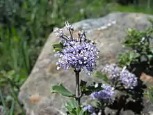 Ceanothus confusus is a species of shrub in the family Rhamnaceae known by the common name Rincon Ridge ceanothus. It is endemic to northern California where it grows in the coastal mountains north of the San Francisco Bay Area. Its habitats include coniferous forest, woodland, and chaparral.[2] This is a low, spreading shrub often forming a short mat up to about 1.2 meters wide. The stem is gray-brown with new twigs having a reddish color and fuzzy texture. The evergreen leaves are oppositely arranged. Each is up to 2 centimeters long and oval in shape with 3 to 5 large teeth. The upper surface is shiny green and the underside is paler and feltlike in texture with hairs along the veins. The inflorescence is a small cluster of blue or purple flowers. The fruit is a horned capsule about half a centimeter wide.