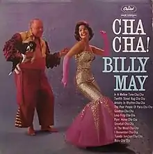 Cha Cha! Billy May is a studio album released by Billy May in 1960 on Capitol LP record T1329 (monophonic) and ST1329 (stereophonic).[1] The album features instrumental Latin renderings of big band standards and theme songs of many top musical outfits. Many of the arrangements are done tonge-in-cheek, even Capitol's own publicity described "Twelfth Street Rag-Cha-Cha" as "unforgivable".[2] Further playfulness is revealed in the song "Good-Bye" in which May's arrangement references the Benny Goodman bandmembers' habit of singing "go to hell, go to hell" over the repeating riff.[3] The album was recorded on October 1, 1959, at Capitol Studios in Hollywood.[1] May's experience arranging and performing this album subsequently influenced his arrangements for the Frank Sinatra album Sinatra Swings.[4]
