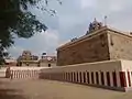 The temple has granite walls enclosing all the shrines and pierced by a five-tiered rajagopuram, the gateway tower. The temple is noted for its exquisite pillars. The presiding deity, Chakrapani is sported with eight arms, each having a weapon and is housed in the central shrine in an elevated structure. Chakrapani is sported with a third eye on his forehead. The Eastern and Western entrances of this temple are known as "Thatchinaya Vayil" and "Utharavana Vayil" respectively and outer Prakara of this temple is made in the form of balcony. There is a bronze image of king Serfoji II worshipping the lord as he is said to have been cured an illness by the grace of this God. A panchamukha (five-faced) Hanuman is erected in the prakaram (outer precincts of the temple).[10] Agampara Vinayakar, Panchamuga Aancheneyar and Vijayavalli are the important idols located in this temple.