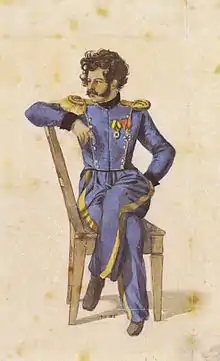 Christian Wilhelm von Faber du Faur (18 August 1780 in Stuttgart – 6 February 1857 in Stuttgart) was a painter and an officer in the army of the Kingdom of Württemberg. He first devoted himself to painting, but subsequently became a soldier, and as a lieutenant in the 25th Division (the Württemberg unit) of the III Corps of Napoleon's Grande Armée, served in the French invasion of Russia, which he sketched as it progressed. His sketches were exhibited in 1816, and subsequently he used them to produce color plates, and then in 1831-44 published some of them, with text, in a work entitled Blatter aus meinem Portefeuille im Laufe des Feldzugs 1812,. His most noteworthy paintings are The Passage of the Beresina, a work of great merit, and The Coffee-House at Wilna. He attained the rank of general in 1849.