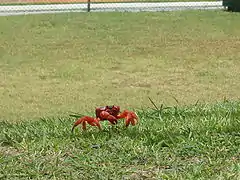 While the red crab is Christmas Island's most numerous crab, the island also hosts the world's largest population of coconut crab (Birgus latro),[8] the world's largest land invertebrate.[9] There may be as many as one million coconut crabs on Christmas Island.[10] It is also home to several species each of hermit crab, grapsids and gecarcinucoidea.[8]