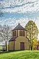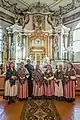 During the centuries, the wooden church was repaired and rebuilt many times. The church was rebuilt in 1648 and 1675. The present-day church was consecrated in 1774 and completed in 1778. It features folk architectural forms. In 1888, the church was enlarged by adding a sacristy and its altars were gilded. The church tower was built in 1867 and the belfry was added in 1899. The church and major buildings survive from 1899 without major alterations.[1] The church is built from wood. It has one nave but a Latin cross floor plan. Side chapels are separated from the main nave by wide segmental arches. The interior is decorated in folk Baroque style with wall and ceiling murals and Doric columns. The church has five altars.[5] Its pipe organ was built in 1854 and has 13 stops. Its pedal keyboard is not connected to the pipes and was likely added in the 20th century.[6] The belfry measures 6.4 by 4.26 metres (21.0 ft × 14.0 ft) and reaches 9 metres (30 ft) in height. It has a hip roof, two floors, and three bells named after Saints George, Joseph, and Thecla.[7]