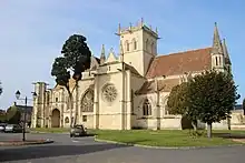 Work was also carried out in the 16th century,[8] in Flamboyant Gothic style.[22] The destruction of the statue of Christ Saint-Sauveur, "a large worm-eaten crucifix" according to Théodore Beza,[36] is attributed to Admiral de Coligny's Huguenots in 1562,[30] stationed in the town awaiting English aid[22] after having sacked Troarn Abbey.[36] This episode took place at the start of the Wars of Religion.[36] A fire is said to have left its mark on the bell tower.[37]