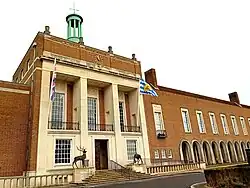 Construction of the new building began in spring 1937.[4] It was designed by Charles Holloway James and Stephen Rowland Pierce in the Neo-Georgian style with Scandinavian elements,[5] built by C. Miskin & Son of St Albans and opened without ceremony in summer 1939.[4] The design for the building involved an asymmetrical main frontage facing the Bullocks Lane; the left section of three bays featured a portico with four full height piers supporting a frieze with the words "Tertium iam annum regnante Georgio VI haec curia aedificata est" ("This building was constructed during the third year of the reign of George VI"); the portico contained a doorway flanked by square windows on the ground floor and it contained tall sash windows in a recess on the first floor; there was a copper-clad cupola at roof level; the right section contained a loggia of eleven bays on the ground floor and seven sash windows on the first floor.[1] The principal room was the council chamber which was contained in a curved structure which jutted out of the main building to the west.[6]