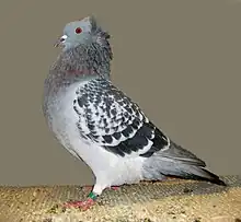 The Crested Soultz is a breed of fancy pigeon. Crested Soultz, along with other varieties of domesticated pigeons, are all descendants from the rock pigeon (Columba livia).