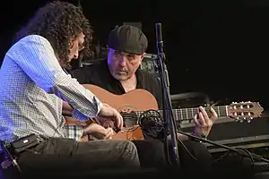 In 1999, a New York Times reviewer described Hayes and Cahill's approach as "stripping old reels and jigs to their essence, leaving space between the notes for harmonics and whispered blue notes," resulting in "a Celtic complement to Steve Reich's quartets or Miles Davis's Sketches of Spain. "[7] They toured extensively and released three recordings on the Green Linnet label: The Lonesome Touch (1997), Live in Seattle (1999), and Welcome Here Again (2008).[8] Cahill and Hayes, along with singer Iarla Ó Lionáird, fiddler Caoimhín Ó Raghallaigh and pianist Doveman, were the members of The Gloaming, an Irish-American supergroup whose first album was released in 2014, winning the Meteor Choice Music Prize for Irish album of the year.[9][10]