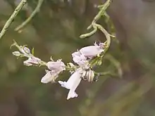 The flowers are borne singly or in pairs in leaf axils on stalks 2–4 mm (0.08–0.2 in) long which are often sticky or scaly due to resin. There are 5 slightly oblong to lance-shaped sepals which are hairy on the inner surface and margins and are 4–6.5 mm (0.2–0.3 in) long. The petals are 9.5–13 mm (0.4–0.5 in) long and joined at their lower end to form a tube. The petal tube is usually lilac-coloured to white and lacks spots. The outside of the petal tube and petal lobes are hairy. The 4 stamens are fully enclosed in the petal tube. Flowering occurs from July to October and is followed by fruits which are oval-shaped, hairy and 3–5 mm (0.1–0.2 in) long.[2][3][4]