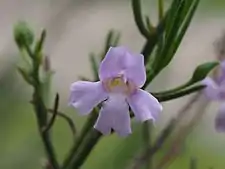 The flowers are borne singly or in groups of up to 3, in leaf axils on a smooth, shiny stalk 6–30 mm (0.2–1 in) long. There are 5 overlapping, egg-shaped to lance-shaped, shiny green sepals which are 3.5–6 mm (0.1–0.2 in) long. The petals are 12–25 mm (0.5–1 in) long and joined at their lower end to form a tube. The petals are a blue, mauve or purple on the outside and white inside the tube. The petal tube and the lobes are shiny and glabrous but the inside of the tube is filled with long, soft hairs. The 4 stamens are fully enclosed in the petal tube. Flowering occurs in many months of the year but mostly in August and September. The fruits which follow are oval to oblong in shape, glabrous, shiny and sticky and 4.5–7.5 mm (0.2–0.3 in) long.[2][3]