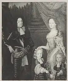 ![]() Fürstin Ernestine Charlotte of Nassau-Siegen, nee Princess of Nassau-Schaumburg, Fürst William Maurice of Nassau-Siegen and their sons Frederick William Adolf and Charles Louis Henry. Anonymous portrait, ca. 1690. Siegerlandmuseum, Siegen. | |