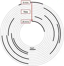 Graphical representation of work effort showing how the bee moves from one side of the nest to another while constructing the envelope. Each arc represents the area the bee worked in a given work session, each lasting approximately from 1 to 2 min. The concentric arcs represent 13 sequential work bouts during a 26 min session of construction; the outer-most arc is the starting position at the beginning of the session and the inner-most one is the ending position.