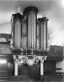 The Lutheran congregation bought the Ververij in 1641, for 4,000 Carolus guilders. Much of the funds were raised from Lutheran communities on the Baltic Sea. The church was likely enlarged in 1667, since there is documentation for building materials worth over 400 Carolus guilders,[1] and by 1718 had between three- and four hundred members.[2] Renovations took place in 1725, and a new parsonage was built. It was renovated again in 1734–35, when a new front gable was placed and a pulpit by Pieter de Nicolo was installed. The purchase of an organ was approved in 1780, and after many delays it was installed in 1782, from the shop of Gideon Thomas Bätz. The organ had ten registers, and cost 1,800 guilders.[1]