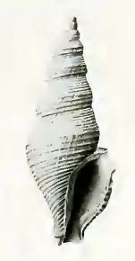 Sculpture:—The radial sculpture is absent. On the shoulder a sharp angle is defined by a prominent cord, above which six fine and closely packed threads occupy the fasciole area. Below this the cords as they descend become smaller and closer, those in the hollow of the base being the most crowded. There are twenty-two such cords on the body whorl, and three or four on the upper whorls. The right insertion of the aperture :mounts slightly above the plane of the suture. The sinus shows a large U-shaped spout, below which is an incipient varix. Beyond the latter the free limb of the outer lip bends inwards. Within this lip are sometimes a few entering plications. The inner lip shows a sheet of callus, thin above, but with a thickened margin below. The siphonal canal is short, expanding, and open. [2]