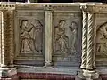 The lower basin is made up of 25 mirrors, each divided into 2 tiles that describe the 12 months of the year, each of which is related to a zodiac symbol. Each month is connected to scenes of daily life and the farming work that characterize it. As in other contemporary sculptures from Europe, in which the months are represented, here the manual work obtains dignity.[5] In this basin manual labour is in fact represented together with the arti liberali (liberal arts), with philosophy, with characters from the Bible and the history of Rome; in this specific order:[6]