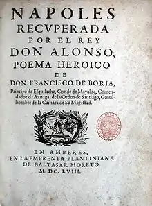 - Naples recuperada por el Rey Alfonso (Naples Regained by King Alfonso V of Aragon). Epic poem in eight-line stanzas and 12 cantos, 1651.