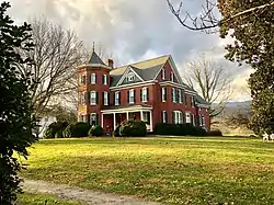 The Franklin Pierce Cover House is a historic house on North Carolina Route 1388 in the small town of Andrews, North Carolina. The 2+1⁄2-story brick Queen Anne Victorian was built in 1900, and is a remnant of Andrews' industrial heritage. The house was built by Franklin Pierce Cover, owner of a local tannery. It exhibits the complex massing typical of Queen Anne houses, with multiple gables, projections, and a massive three-story octagonal tower. Documentary photographs suggest the house once had a Queen Anne porch with brackets and an ornamental frieze, but this was replaced by a more Colonial Revival scheme with heavier Tuscan columns.[2]
