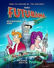 In February 2023, a release window was set sometime around the mid-2023 season.[26] On May 18, 2023, Hulu announced that the season would premiere on July 24, 2023.[27] Hulu's sister streaming service, Disney+ announced, via a press release, that it would also stream the new season of Futurama internationally as a Star Original[28] Disney+ later announced that the season would premiere new episodes around the world simultaneously with Hulu in the United States.[29]