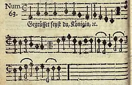 Seidenbusch became priest of Aufhausen in the Diocese of Regensburg in 1667, where he founded a community of brothers. They ran a pilgrimage church Maria Schnee. For this church, Seidenbusch published a devotional collection in 1687, titled Marianischer Schnee-Berg, oder Beschreibung der Andacht bey Unser Lieben Frawen zum Schnee auff dem Berg zu Auffhausen … Sambt Neun und zwantzig Bitt- und Lob-Gesänglein (Marian snow mountain, or description of the devotion of Our Dear Lady of the Snow on the mountain of Aufhaussen, with 29 little songs of prayer and praise). The hymn is titled "Ein schönes Salve Regina Durch welches die wochentliche Andacht zu Auffhausen mit den Engelein beschlossen wird" (A beautiful Salve Regina by which the weekly devotion in Aufhausen with the angels is closed)".[1] Each stanza contains a short acclamation of Mary, taken from the Latin Salve Regina, and a long refrain in German, ending with the Latin line "Salve salve, salve Regina".[1] The refrain, calling the cherubim and seraphim to sing to their queen, is not taken from the Salve Regina.[1]