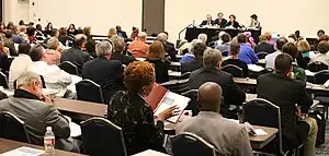 Petitions are assigned to legislative committees based on their content. Legislative committees elect committee leadership and then break into subcommittees to review and refine legislation. Subcommittees bring petitions before the entire committee with the recommendation to reject, adopt, or adopt as amended. During consideration by the entire committee, additional amendments may be made. Then, the entire committee votes to recommend to the General Conference (the almost 1000 delegates) what action should be taken on the legislation. No action is final until taken by the General Conference in plenary session.[5]
