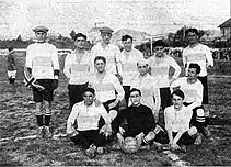 The football team took part in the Primera División championships since 1909, when the squad won the second division title,[3] therefore promoting to the top division. Gimnasia played in Primera from 1910 to 1917 when the team was relegated to the División Intermedia (second division) after finishing 20th of 21 teams.[4] The club disaffiliated from the Association soon later, although football has remained as one of the sports practised up to present days.