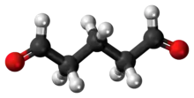 Glutaraldehyde is an organic compound with the formula (CH2)3(CHO)2. The molecule consists of a five carbon chain doubly terminated with formyl (CHO) groups. It is usually used as a solution in water, and such solutions exists as a collection of hydrates, cyclic derivatives, and condensation products, several of which interconvert. Because the molecule has two carbonyl group that are reactive to primary amine groups (even as its hydrates), it can function as a crosslinking agent for any substance with primary amine groups and develop imine connected links. Crosslinking rigidifies and deactivates many biological functions, so in this way, glutaraldehyde solutions are used as biocides and as fixative. It is sold under the brandname Cidex and Glutaral.[3][4][5][6] As a disinfectant, it is used to sterilize surgical instruments.[3]